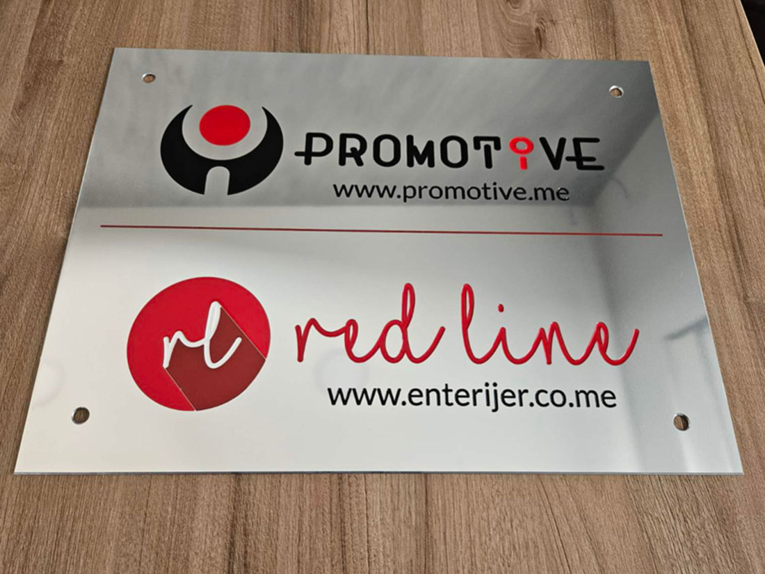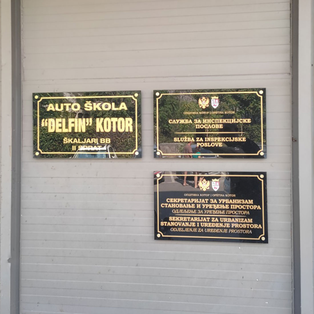 Prva stvar koja dočeka vašeg klijenta je kompanijska tabla na ulazu u vaš objekat. Možemo slobodno reći da je ona lična karta vaše firme. Mi ih izrađujemo od aluminijuma, mesinga, alubonda, pleksiglasa, drveta kao i kombinacijom različitih materijala da bi one bile pravo ogledalo vaše firme. Table mogu biti od jednostavnih štampanih od trodimenzionalnih rađenih različitim tehnikama gravura i štampe sa posebnim efektima.