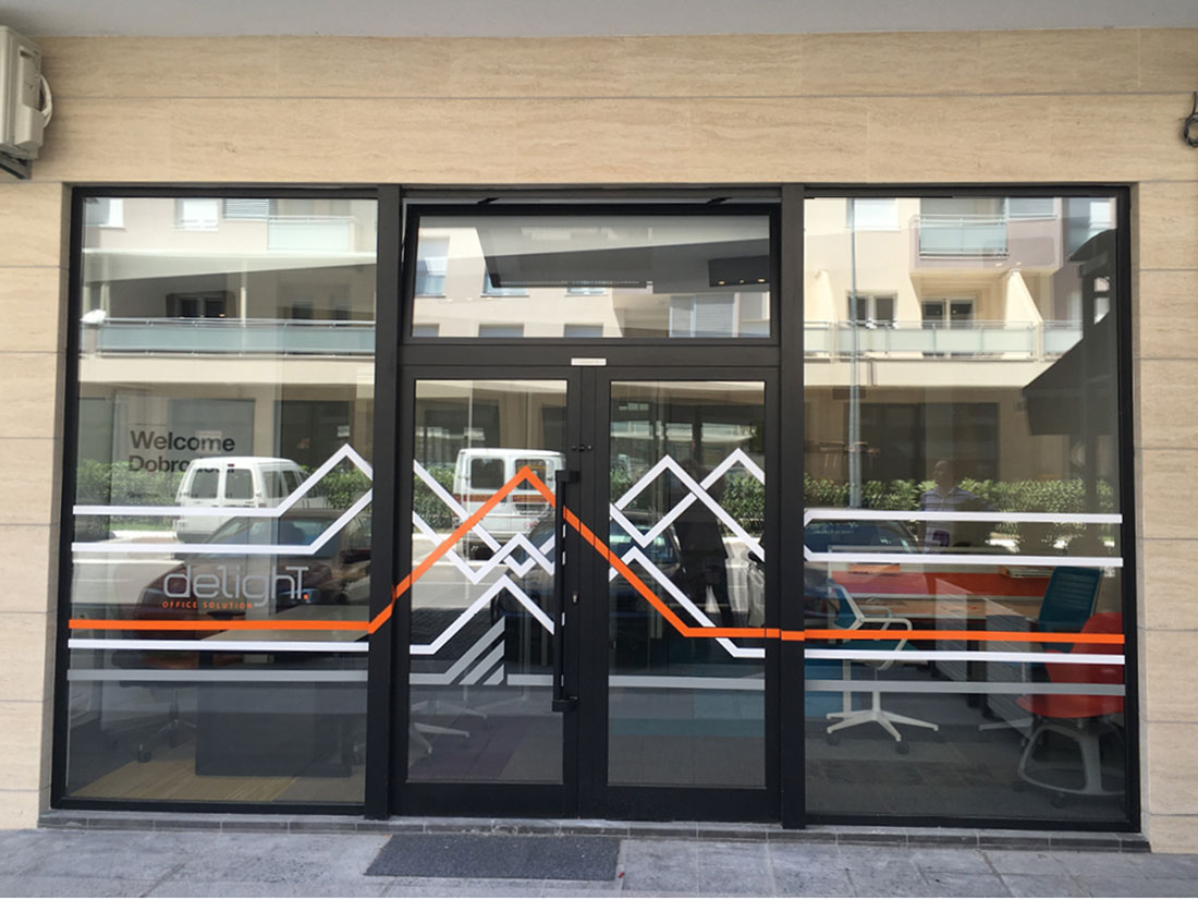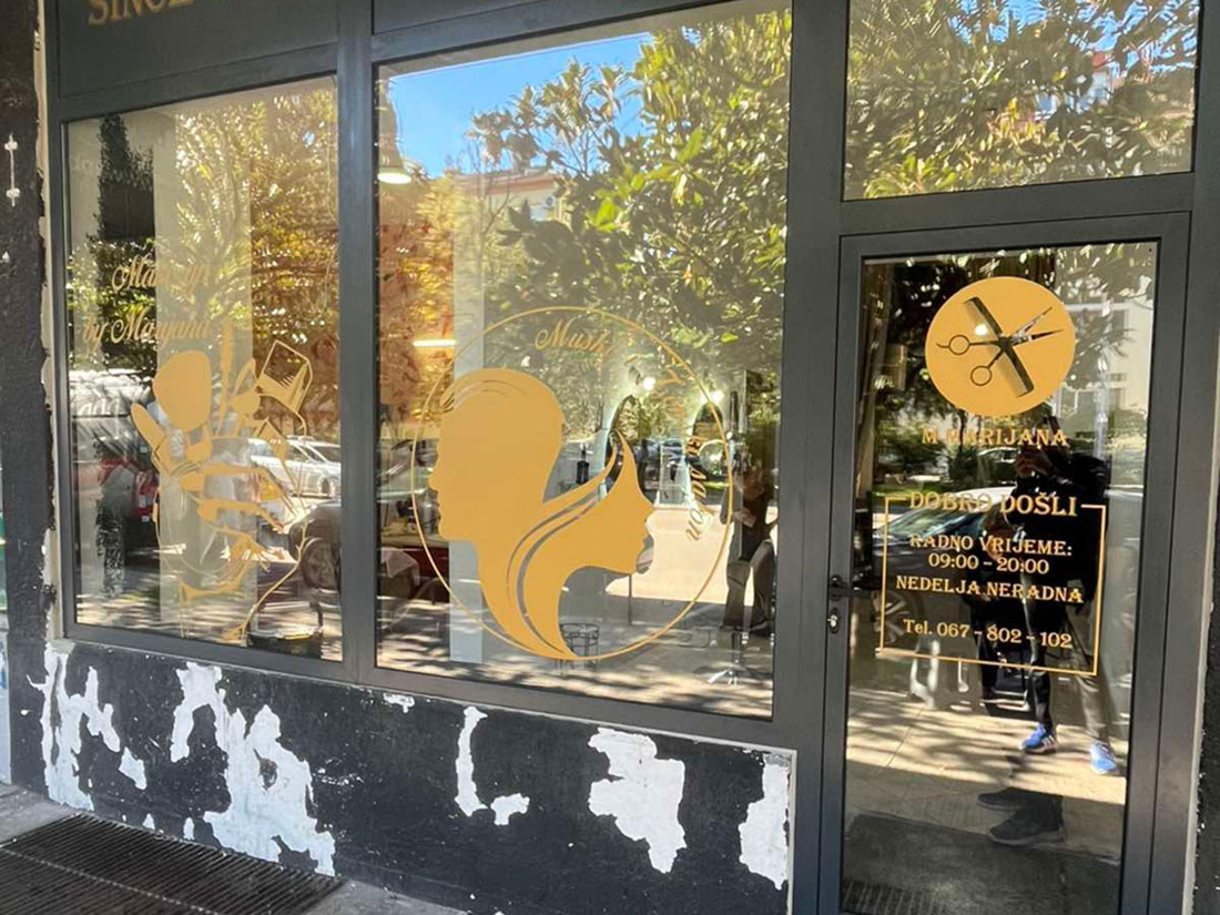 This film is not printed but cut into desired shapes, letters, numbers, and similar forms according to the client’s request. The design must be prepared in vector format since the film is cut along the contours of the shapes or letters. After cutting, it is covered with a special transfer film, which is used to apply it to glass.